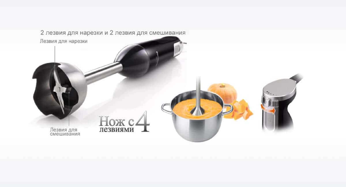 Мощный мотор 600 Вт, 2 лезвия для нарезки и 2 лезвия для смешивания обеспечивают быстрое и эффективное измельчение продуктов. Отличное решение для приготовления соусов и фруктовых коктейлей. Нога из нержавеющей стали позволяет приготовить суп или соус непосредственно в кастрюле. Кроме того, в зависимости от твердости ингредиентов можно регулировать скорость измельчения.