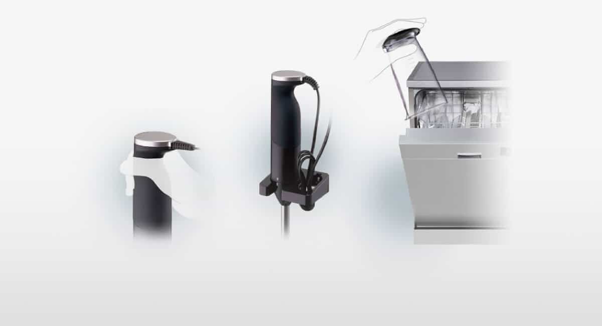 Эргономичная ручка легко помещается в руке, а ногу из нержавеющей стали, стакан и чашу для измельченных продуктов можно мыть в посудомоечной машине. Погружной блендер можно аккуратно разместить на прикрепленной к стене подставке для экономии места на кухонном столе. Благодаря этому блендер всегда будет под рукой.